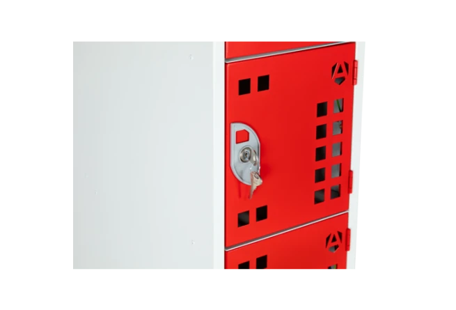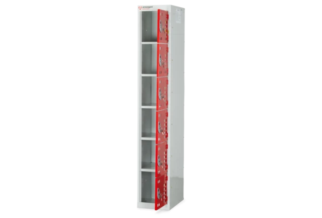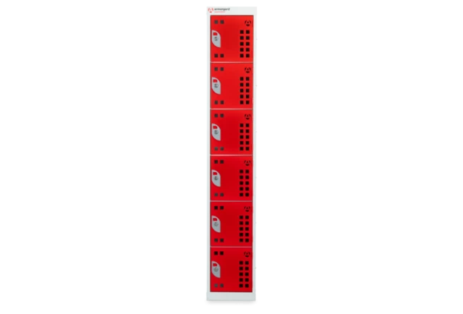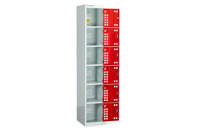 The Armorgard Powerstation is a battery charging locker bank. Designed to charge power tool batteries whilst keeping them safe & secure – Ideal for the site office. Six separate compartments, each containing double sockets connected in series to a 230V RCD protected plug.