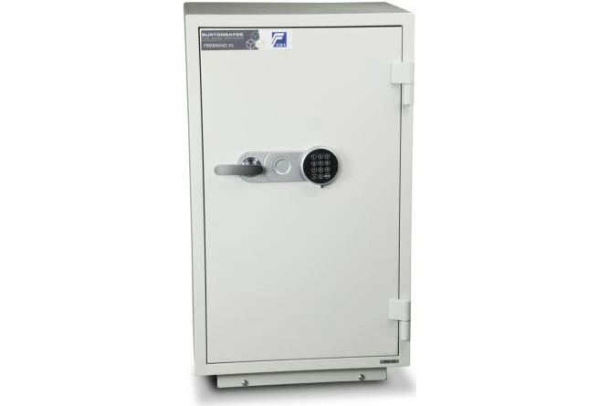 The Burton Firebrand is a fireproof safe that offers 60 minutes fire protection for paper documents. It has an insurance rating of £1,000 for cash and £10,000 for valuables. It can be anchored to the base for added security.