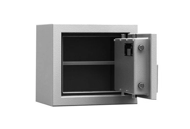 The prisma-1 is equipped with 1 adjustable shelf(s) with external dimensions 350 x 390 x 265 mm. The specified external depth is excluding 50 mm for the handle and lock. The safe has a capacity of 12 litres and a weight of 41 kg.